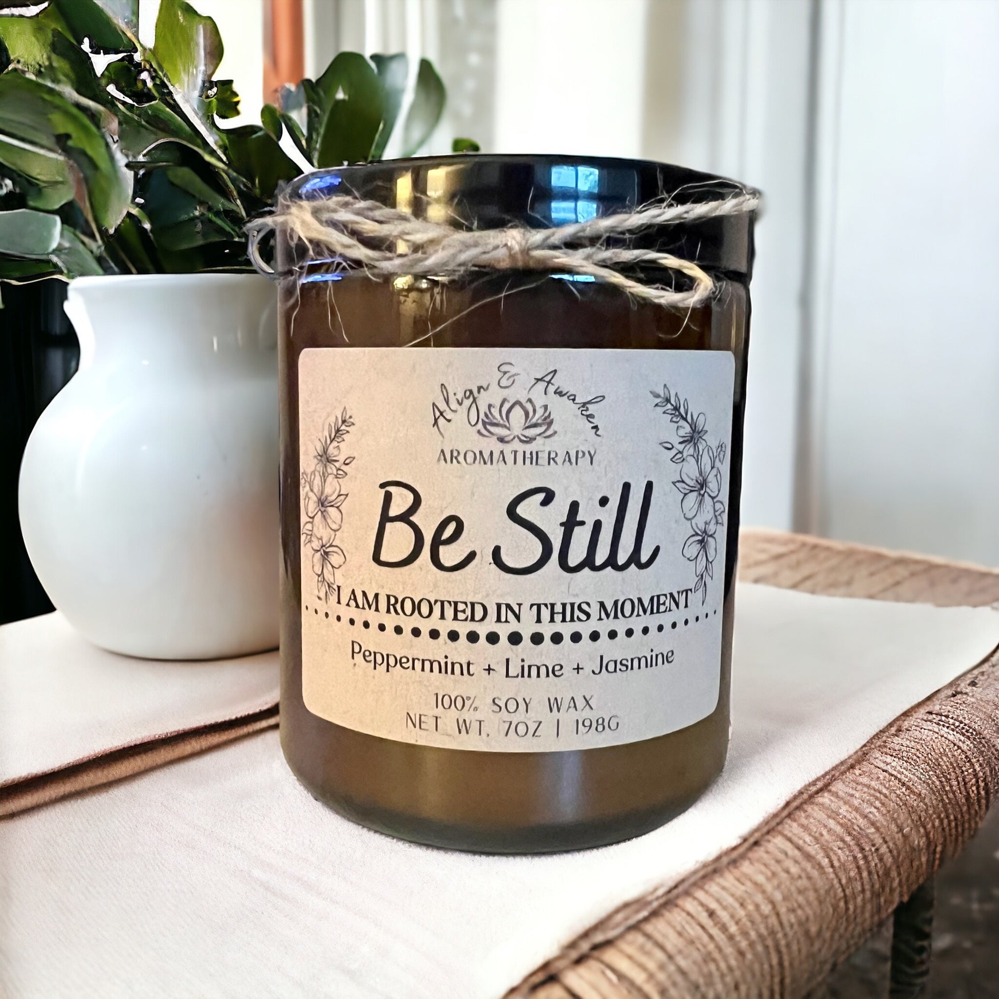 Experience the feeling of being present with the Be Still Affirmation Soy Candle. Hand-blended with Peppermint, Lime, and Jasmine essential oils, this candle emits an invigorating aroma. Light it and recite the mindful affirmation for being anchored in the present moment. Let the peppermint top note, be a daily reminder to embrace the present moment. Bring mindfulness into your life with the Be Still Affirmation Soy Candle.