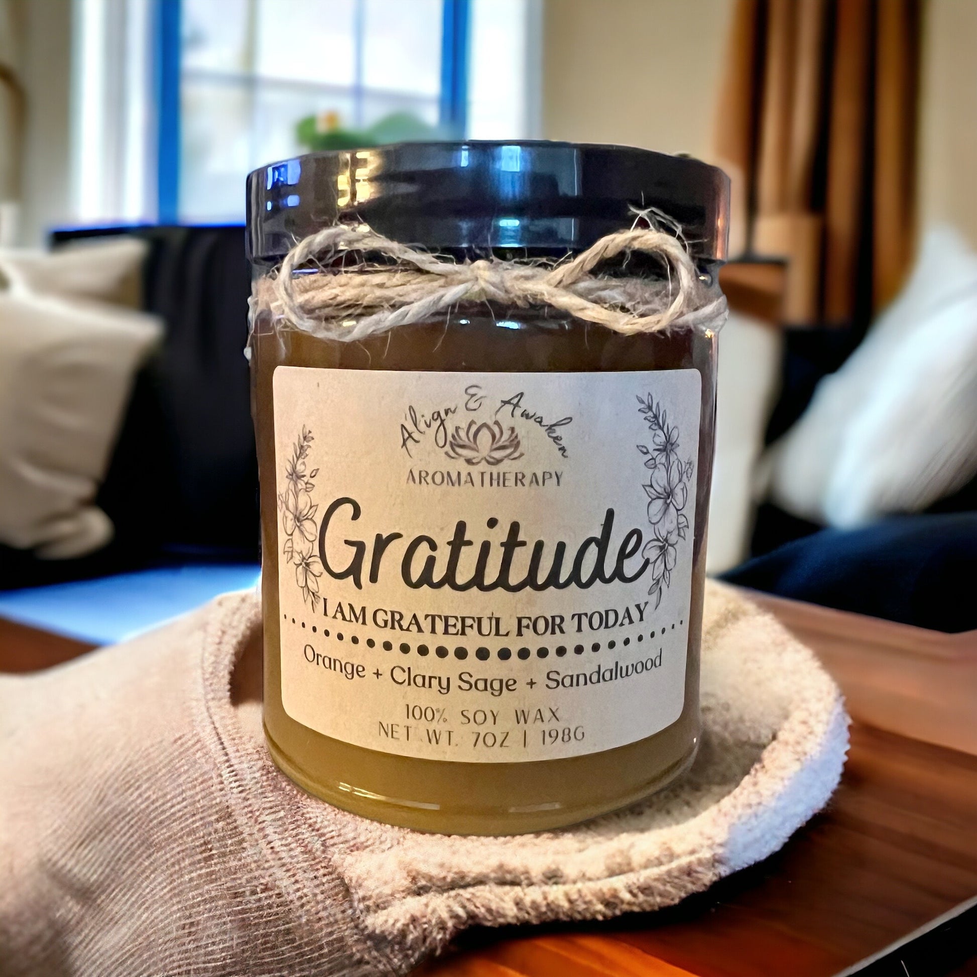 The Gratitude affirmation candle combines the powerful scent of Clary Sage essential oil with an uplifting note profile of Sandalwood and Orange. Light this candle and speak the affirmation to experience a sense of appreciation in your home. This candle uses high-quality, non-toxic ingredients and precision in the blending process. Fill your space and heart with thankfulness by lighting the Gratitude candle.