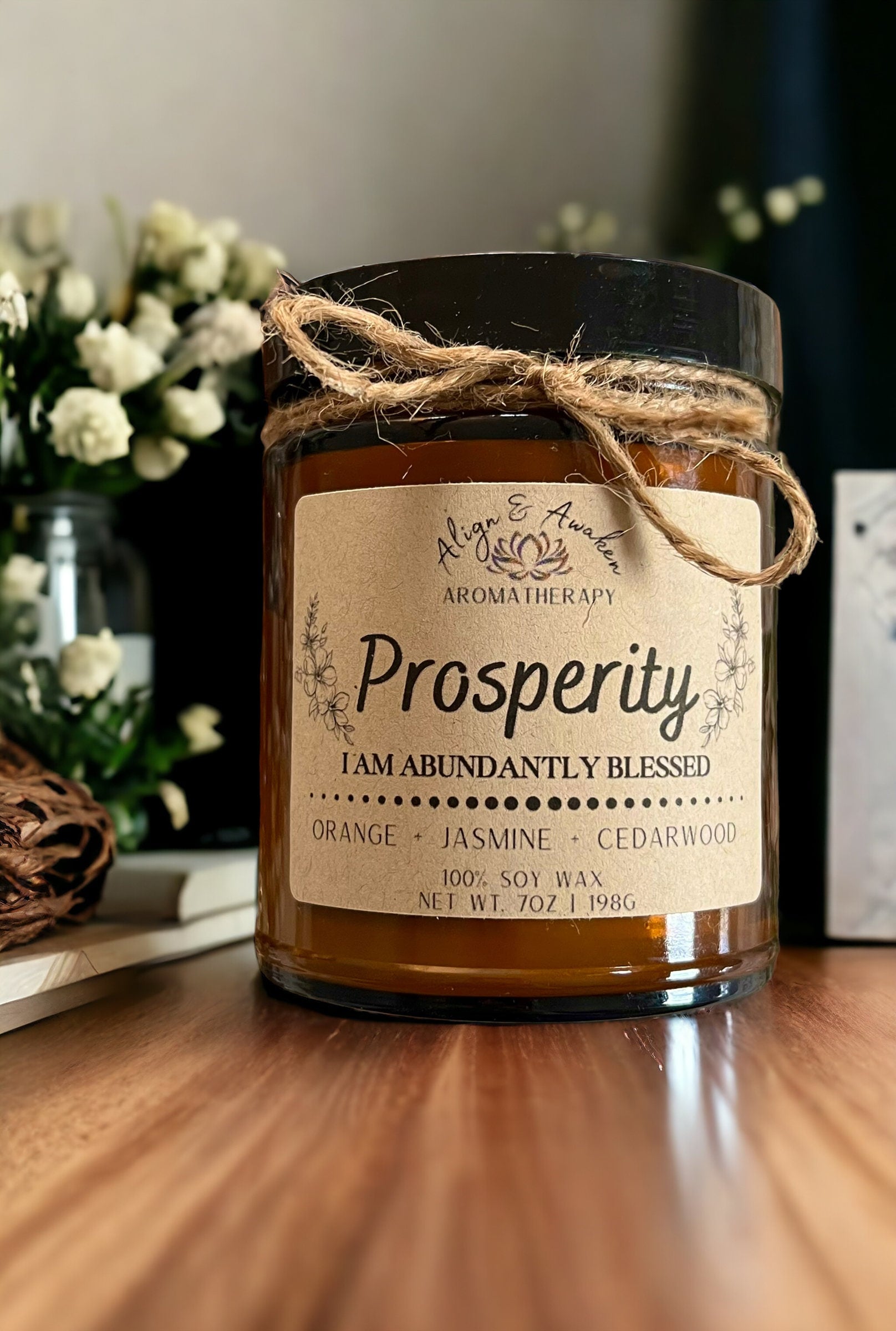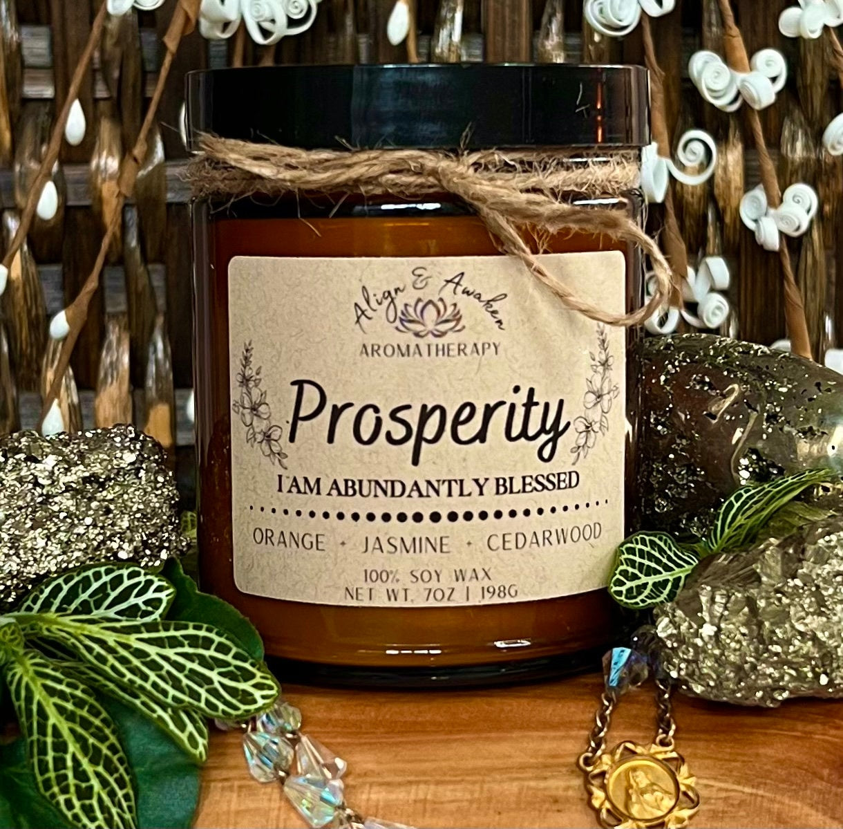 The Prosperity affirmation candle will raise your vibration and attract abundance into your life. Made with sweet orange and floral essential oils, it features a top note of citrusy sweet orange, middle notes of jasmine, and base notes of wood and tonka bean. Lighting this candle and saying the included affirmation can help manifest prosperity in your life.