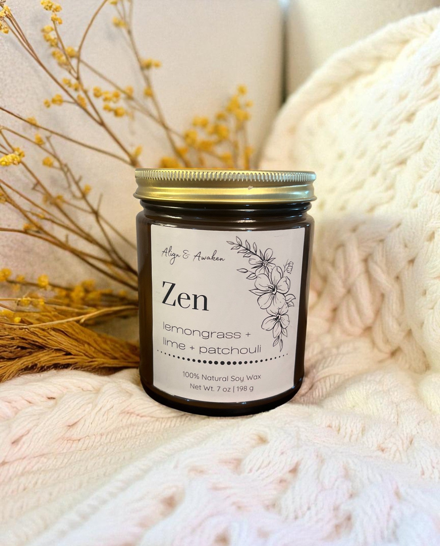 Pamper yourself with The Mind, Body, Spirit Collection and indulge in the soothing aroma of The Zen Aromatherapy Soy Candle. Combining the invigorating scents of Lemongrass, Lime, and Patchouli, this citrusy candle will leave you feeling refreshed and recharged, as if you just had a day at the spa. Made with essential oils, it's the perfect addition to your self-care routine. Let yourself be the top priority and enjoy the love and relaxation that the Zen candle provides. You deserve it.